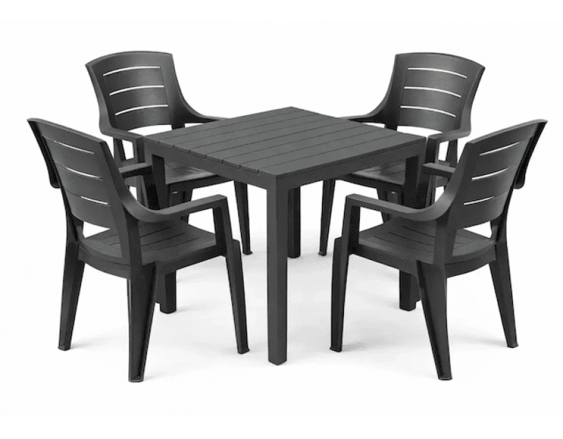 Набір розрахований на комфортне розміщення 4 персон та стане стильним та практичним рішенням для обідньої зони на терасі, у кафе чи на дачі. Гармонійний дизайн столу та крісел, виконаних з імітацією дерев'яних дощок, створює ефект натурального матеріалу та легко поєднується з різними стилями простору.