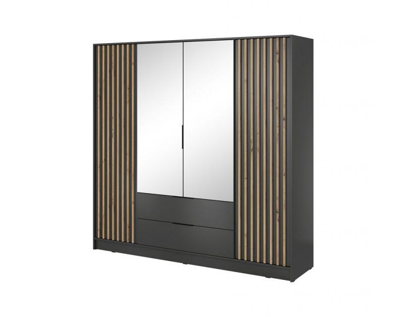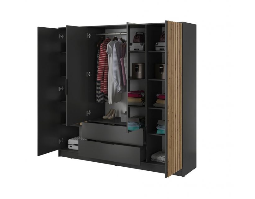Вам набридло шукати місце для зберігання вашого одягу? Шафа для одягу Perfect Home Неллі стане ідеальним рішенням для вашої оселі. Ця 4-дверна модель вражає сучасним дизайном та елегантним поєднанням графітового кольору з дубом артизан, що надає вашій кімнаті особливого шарму.