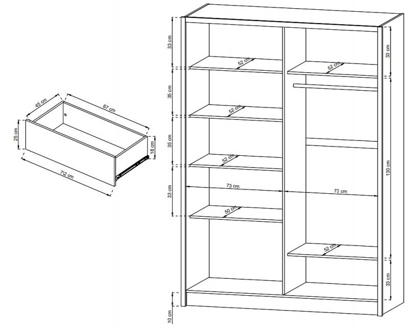 Ця шафа створена для тих, хто цінує якість та практичність. Просторий внутрішній простір дозволяє зручно зберігати одяг, взуття та аксесуари, а продумане розташування полиць та штанги для вішалок забезпечує легкий доступ до ваших речей. Не витрачайте час на пошуки – все буде під рукою!