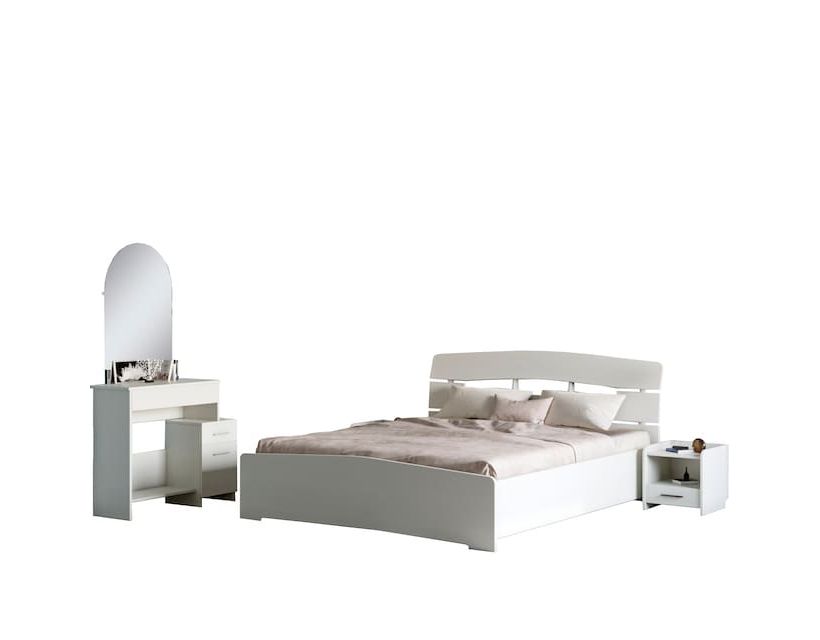 Спальня Еверест Комплект 1 (модульна - 3 елементи) німфея Альба Біла спальня - це ідеальний варіант, який здатний додати до вашої кімнати трохи розкоші. Зробити це можна завдяки меблевому гарнітуру Комплект 1 від української фабрики Еверест – це дуже красиве та стильне рішення, яке здатне змінити будь-яку кімнату. Розкішне двоспальне ліжко Марго комплектується основою під матрац у вигляді щита з додатковими ребрами жорсткості. Трюмо-1 із закругленим дзеркалом на мініатюрному столику, збоку компактна тумба з однією шафкою та невеликою скринькою. Невелика тумбочка буде відмінним доповненням спального гарнітура. Комплектація: 1. Ліжко двоспальне Еверест Марго 2. Тумба ліжка Еверест Т-1 Трюмо-1 комплект для спальні 3 елементи Еверест