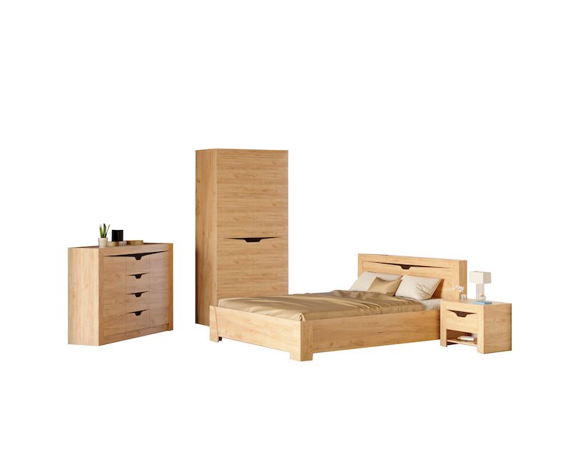 Спальня Ліберті Комплект 4 (4 елементи) Дуб крафт золотий Дуже стильним та сучасним варіантом є спальня Ліберті Комплект 4 меблевої компанії Еверест – додасть будь-якій кімнаті елегантності. Така спальня буде дуже стильним рішенням, додасть світла та простору вашій кімнаті. Меблевий гарнітур складається з чотирьох елементів колекції Ліберті. Така спальня чудово підійде до будь-якого сучасного інтер'єру. Головною особливістю цих меблів є врізні ручки, що дозволяє встановити комплект навіть у дитячій кімнаті. Замовити елемент меблів можна окремо, а можна купити одразу цілий комплект і просто встановити його вдома. Комплектація: 1. Шафа 1000 Ліберті (ШхГхВ) 2. Ліжко Ліберті 1400 (ШхВхД) 3. Тумба ліжка Ліберті (ШхГхВ) 4. Комод Ліберті 1400 (ШхГхВ)