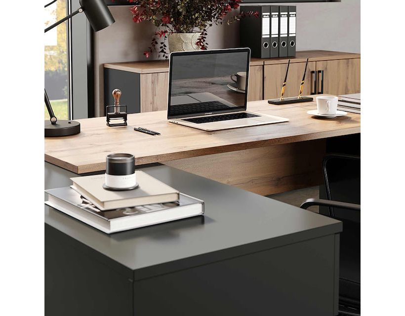 | Додатково | Фурнітура: Пластикові ручки та ніжки чорного кольору. Трискладові кулькові підвищеної міцності телескопічні напрямні повного висування. Скринька, що замикається для зберігання документів, канцтоварів та інших офісних аксесуарів. |