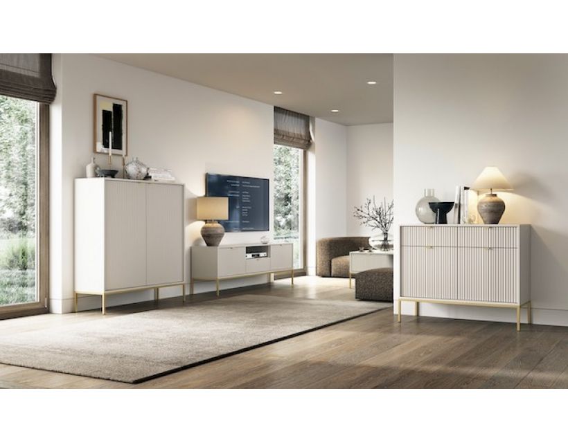Ваша вітальня заслуговує на краще! Тумба під телевізор Perfect Home Нова – це стильний та елегантний елемент, який не тільки доповнить інтер'єр, але й стане практичним рішенням для зберігання. Її сучасний дизайн у кольорі кашемір надає приміщенню затишку та вишуканості, а золоті ніжки додають нотки розкоші.