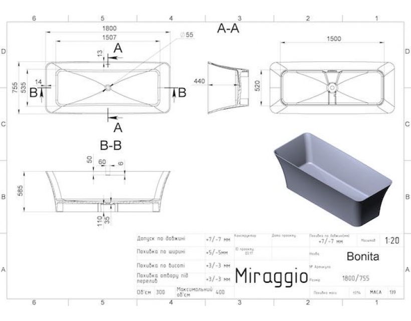 | Диаметр сливного отверстия, мм | 55 |