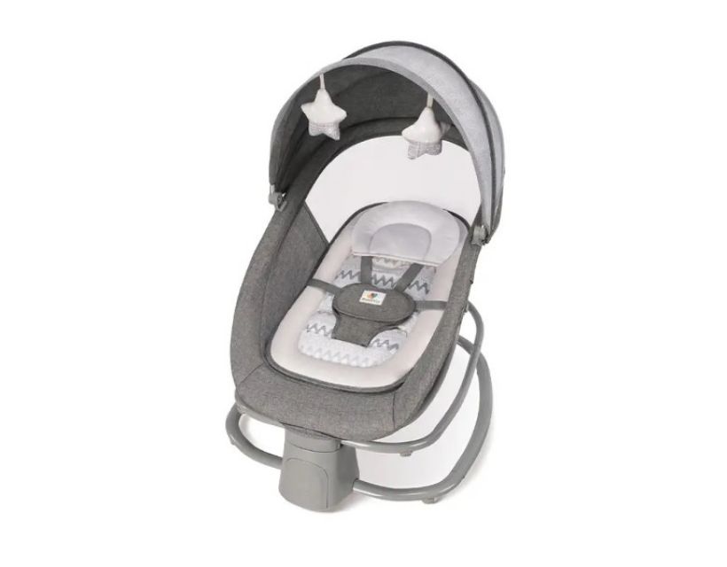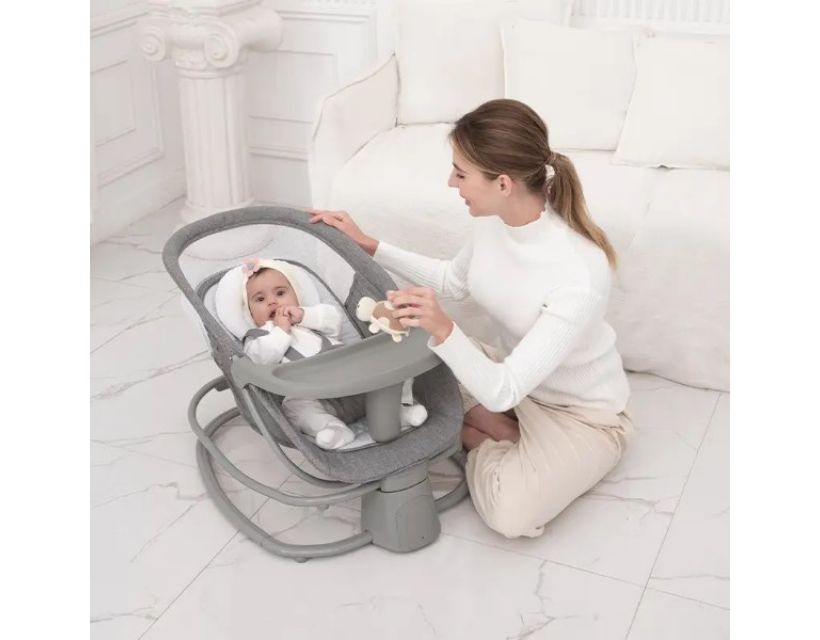 Характеристики: Тип: 4 в 1 (убаюкающий центр, шезлонг-качели, стульчик, стульчик со столиком) Возраст: от рождения Максимальная нагрузка: 18 кг Материал: металл, пластик, ткань – лен. Удобное сиденье имеет мягкий матрасик и подушечку для новорожденных. Плавная регулировка наклона спинки. Ременная регулировка угла наклона спинки (132° – 158°). MP3, Bluetooth, USB вход. Центр имеет 5 скоростей качания и таймер, который позволит автоматически остановить качание через 15, 30, 45 или 60 минут (по умолчанию). Центр можно использовать как шезлонг или стульчик. Есть специальные стопоры для шезлонга. 5-точечные ремни безопасности с паховой накладкой регулируются под ростом ребенка. 2 подвесные игрушки развлекут во время бодрствования, игрушки снимаются при необходимости. 15 мелодий с регулировкой громкости успокоят и укачивают малыша. В комплект входит москитная сетка. Съемный столик с защитой от сползания. Укачивающим центром можно управлять с помощью программы APP (Android, iOS), устанавливаемой на телефон. Обивка кресла снимается и стирается при температуре 30 градусов деликатного режима стирки. Укачивающий